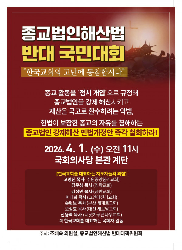 오는 4월 1일 오전 11시, 국회의사당 앞에서 열리는 국민대회는 단순한 집회가 아니다. 이는 종교의 자유를 지키기 위한 시대적 응답이며, 신앙의 양심을 드러내는 자리다. 천하보다 귀한 개인과 가정과 자녀의 생명을 지키고 영혼을 사수하기 위한 자리다.
