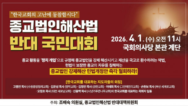 오는 4월 1일 오전 11시, 국회의사당 앞에서 열리는 국민대회는 단순한 집회가 아니다. 이는 종교의 자유를 지키기 위한 시대적 응답이며, 신앙의 양심을 드러내는 자리다. 천하보다 귀한 개인과 가정과 자녀의 생명을 지키고 영혼을 사수하기 위한 자리다.