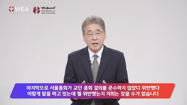 - 주연종 목사 주장: “WEA 서울총회는 교단 결의를 위반하지 않았다.”
